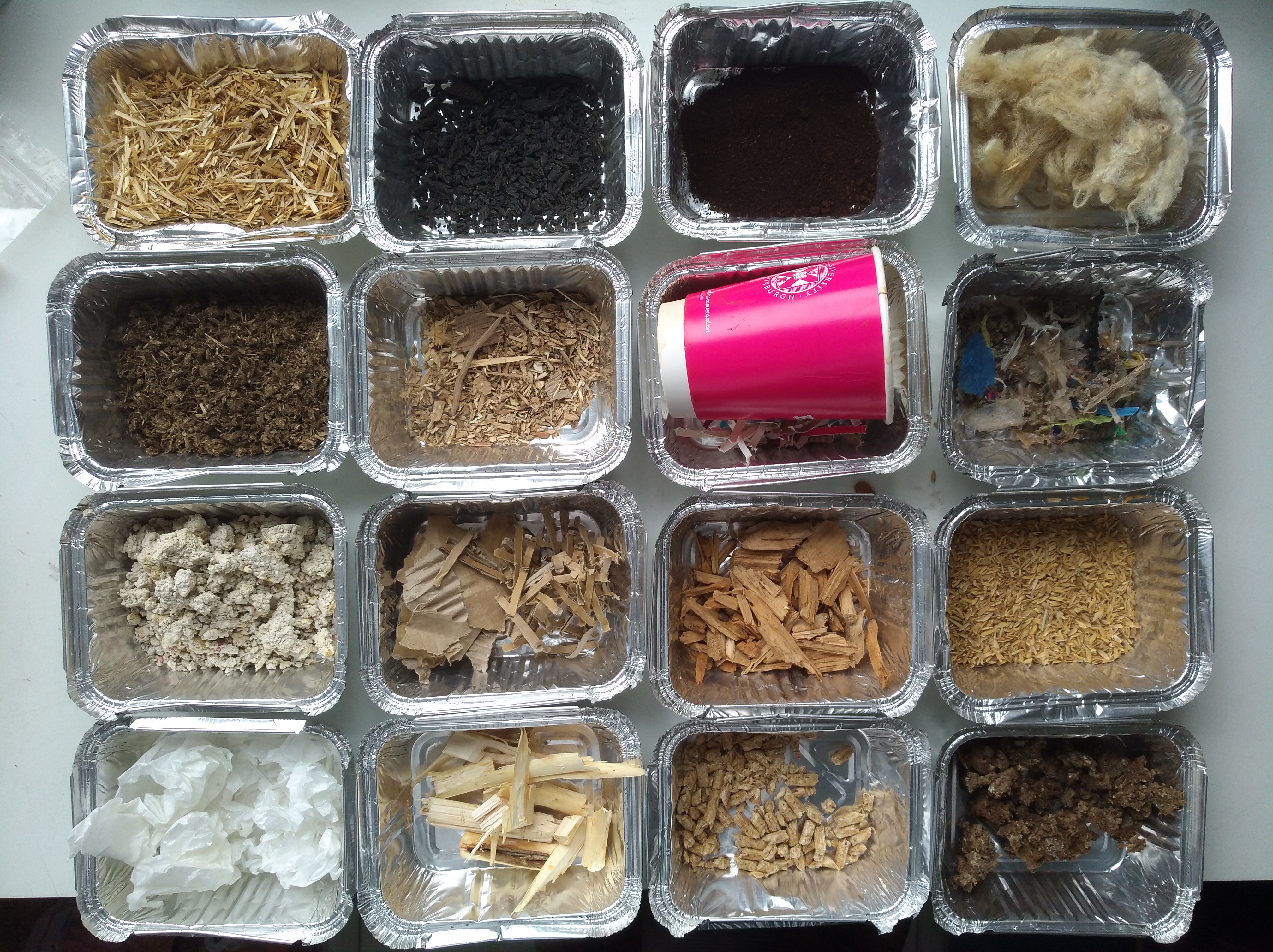 However, while charcoal is only made from wood, biochar is made from any biomass. Here are some examples for biomass that has been used for production of biochar at the UK Biochar Research Centre: Left column to right column: wheat straw, anaerobic digestate from biomass residues, paper mill sludge, paper-plastic composite (bakery wrap), sewage sludge, demolition/waste wood, cardboard, willow wood, spent coffee grounds, coffee cups, pine wood, softwood pellets, wool (Scottish Bourmount, Scottish mule, Blue face Leistea, Scottish Black face, Anglo-Saxon merino), anaerobic digestate from food waste, rice husk, algae (Laminaria Hyperborea stem, brown algae/kelp).