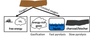 Biochar is produced is via a thermal process called pyrolysis which is similar to combustion. While complete combustion occurs in the presence of oxygen which fully converts the organic material in the feedstock into CO2, pyrolysis takes place in the absence of oxygen. This ensures that the carbon in the biomass is converted into energy-rich gases, liquids and biochar.