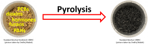 Pyrolysis destroys contaminants in the feedstock, such as PCBs, dioxins, furans, PAHs and even pharmaceuticals, e.g. hormones.